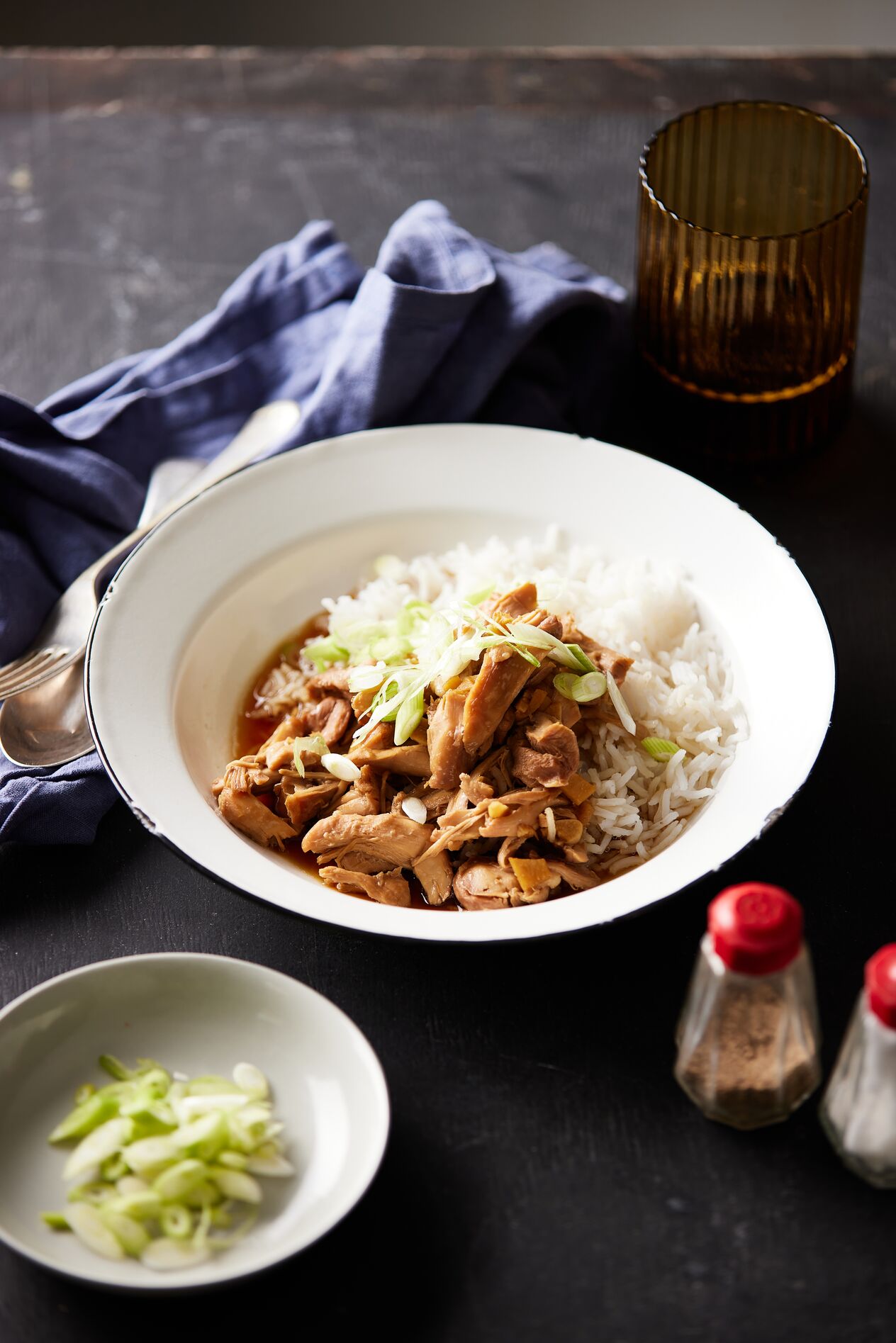 Place rice on a serving dish. Cover with shredded chicken and top with the whites of the spring onion and sprigs of coriander. Pour the master stock into a small jug and serve alongside the chicken and rice dish