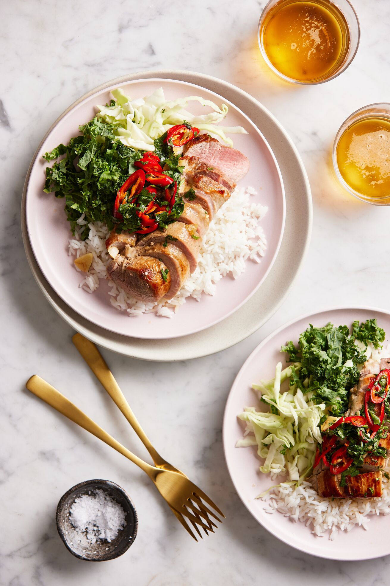 Place a layer of rice on a serving plate. Add the cabbage and kale on top of the rice. Slice the pork and place on top of the salad. Pour over the dressing. Garnish with coriander